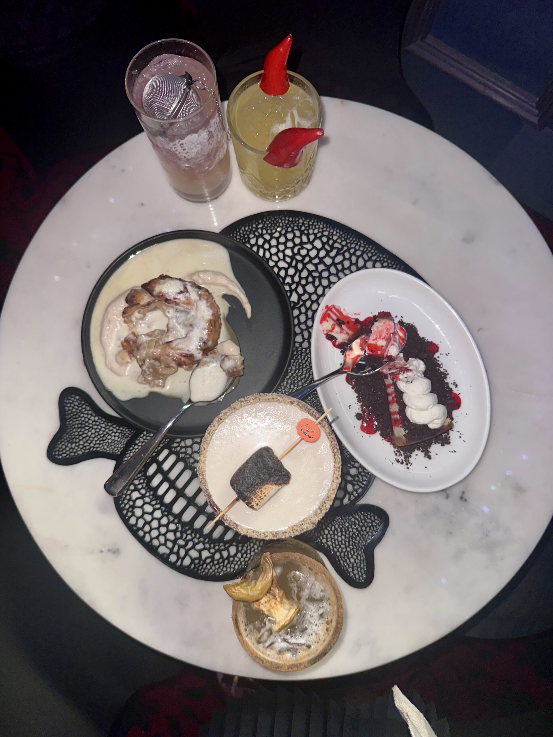 My friend Shira and I conjured up a lineup of creepy cocktails, including the S’mores Martini, Ashes to Ashes, Rotten Orchard, and the Poison Fog. We practically gave them all a perfect 10/10 and if you’re a cocktail lover, you’ll be bewitched by these creations. Even though I’m not much of a drinker, I enjoyed every single one!