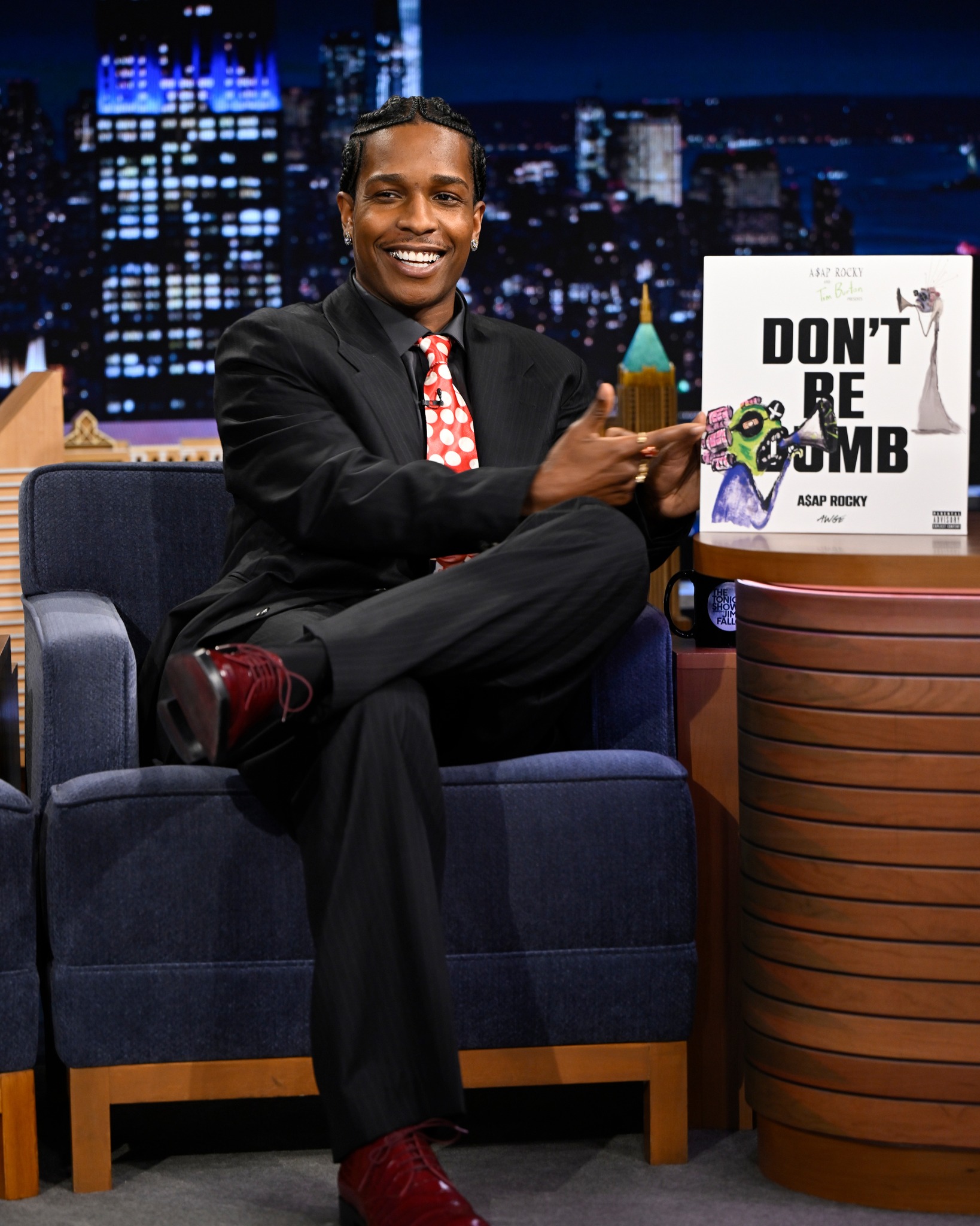 He also revealed details about his upcoming album, Don’t Be Dumb, including his dream collaboration with Tim Burton, who created the album artwork. Rocky laughed about how he “stalked and harassed” Burton for years until the two finally connected. Once they did, Burton and his daughter would spend mornings creating art together, and one of those projects ultimately became the album cover.