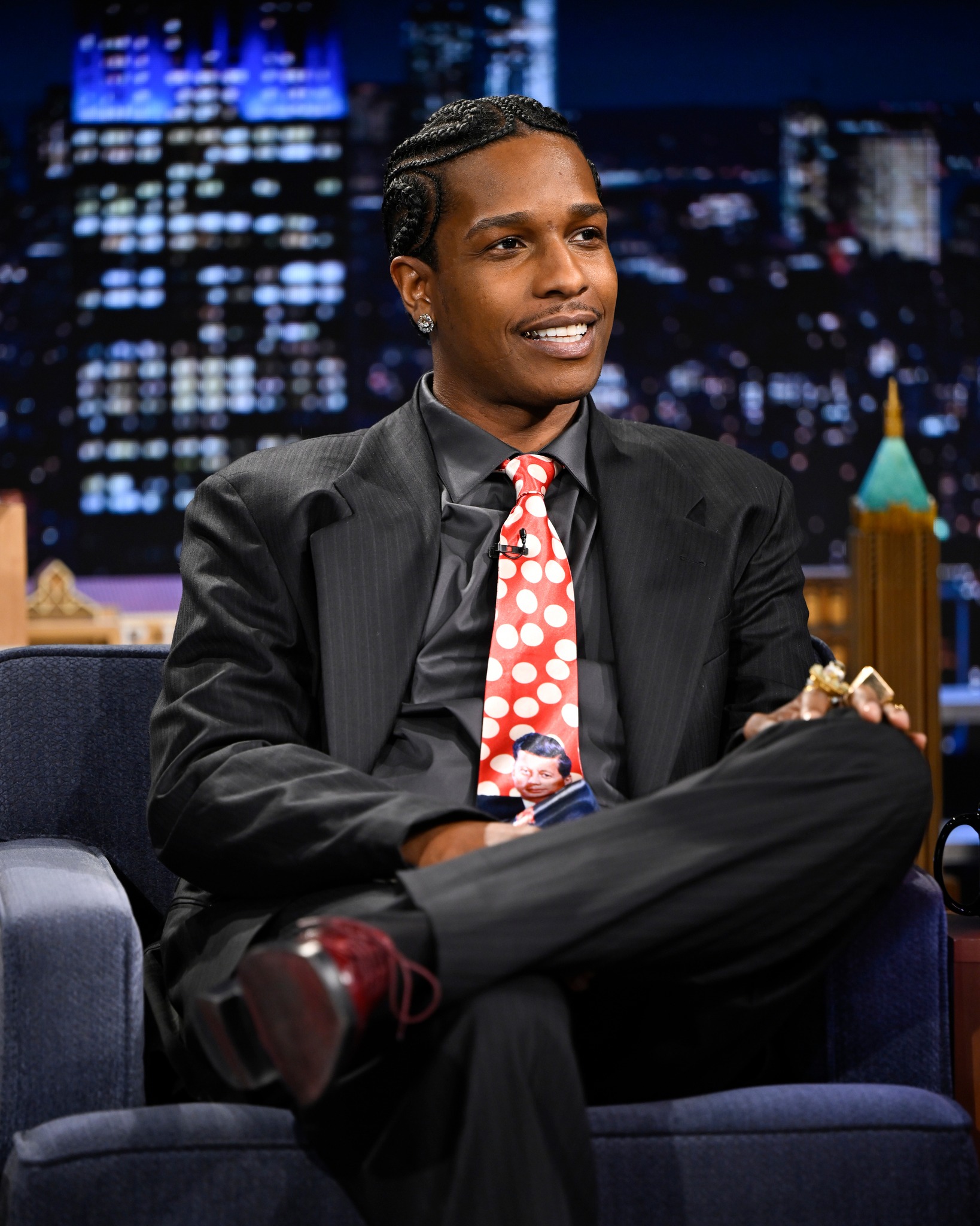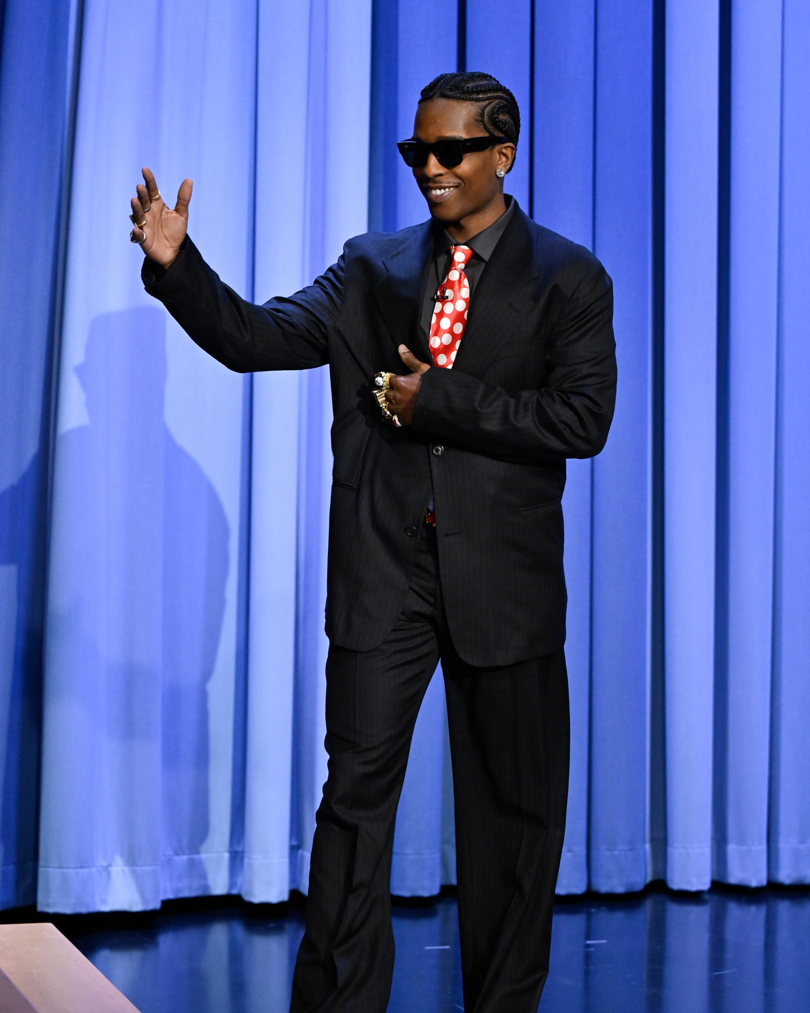 A$AP rocky in a custom ERL polka dot tie with JFK on it, nice!