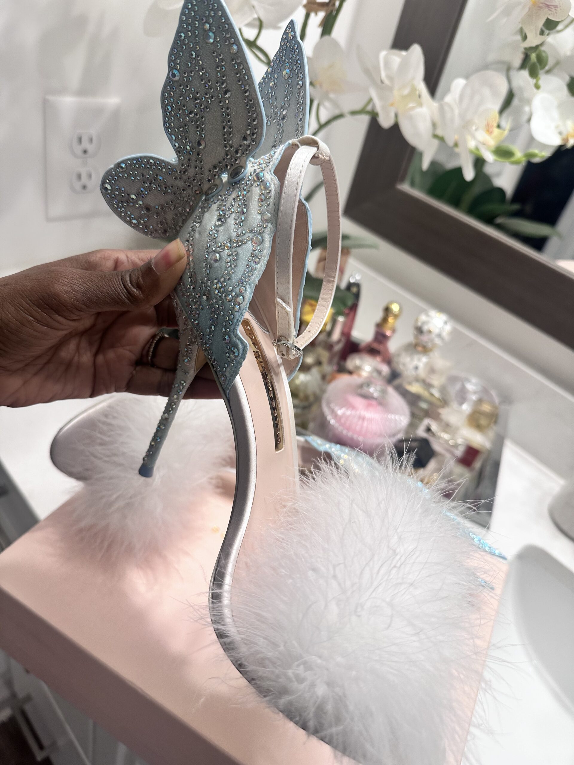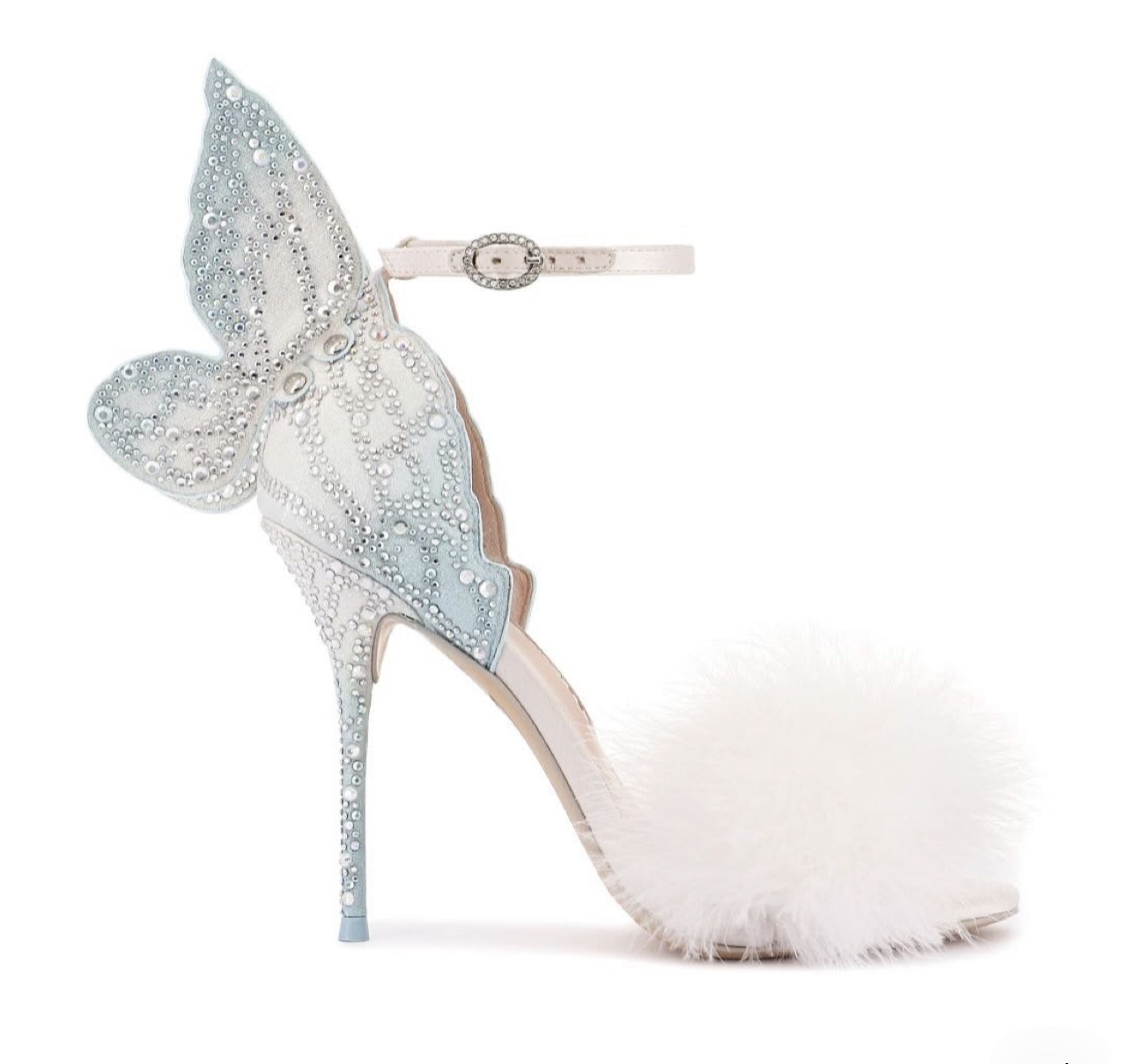 A little slice of heaven, reimagined, these iconic Chiara heels feature Sophia Webster’s signature butterfly wings and a crystal-encrusted heel that feels straight out of a fairytale. The soft marabou feathers across the front strap add an extra touch of whimsy, making them the ultimate celebration shoe.